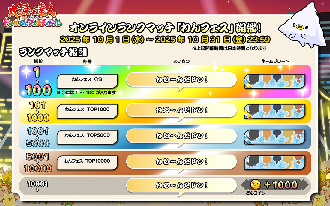 ※2025年9月のオンラインランクマッチ「3周年記念フェス」ランキング報酬は10/1(水)1:00~10/31(金)23:59の期間のみ受け取り可能です。